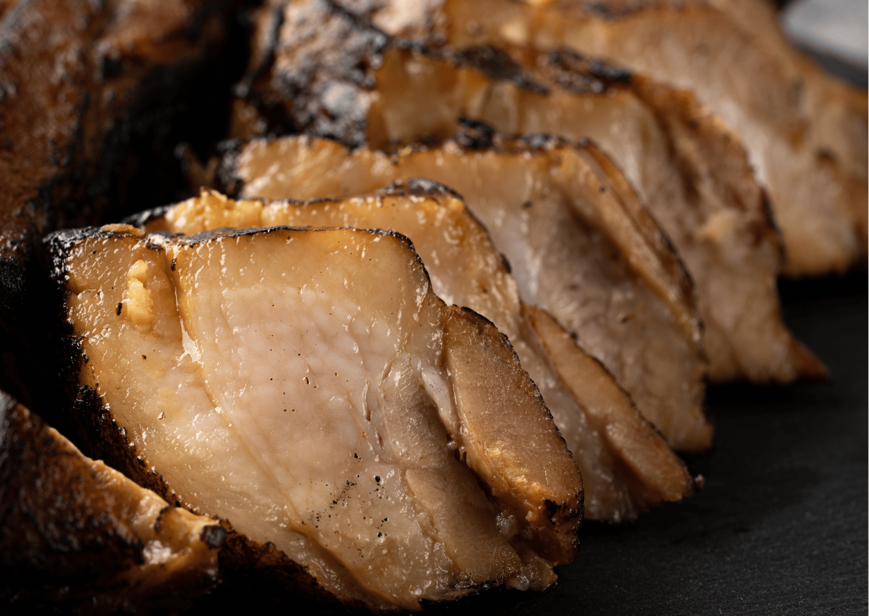 叉燒用豬肩或梅頭肉製成,醃上甜鹹醬料後燒烤,外層焦香紅潤,內裡軟嫩多汁,肥瘦相間咬落甘香彈牙。好嘅叉燒色澤鮮明,香氣四溢,常用喺飯麵或叉燒包入面。